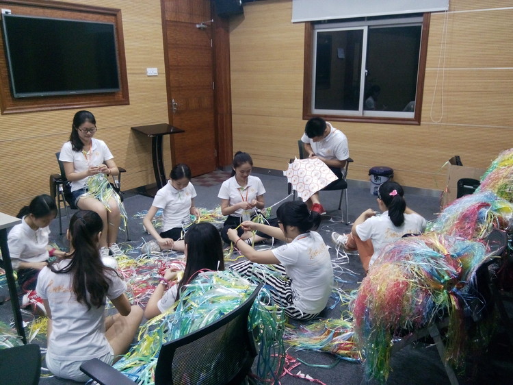為了準(zhǔn)備此次主題活動(dòng),全體教職工們都付出了辛勤的汗水。教師們積極準(zhǔn)備材料,助教們不辭辛苦、加班加點(diǎn)地為全體師生精心趕制草裙300余條,外教Keiron用土豆雕刻出許多叢林印章,藝體教師們?yōu)楹⒆觽冄b扮各種叢林造型的面部彩繪、蓋上叢林印章,為晚會(huì)營(yíng)造了良好的亞馬遜叢林氛圍。