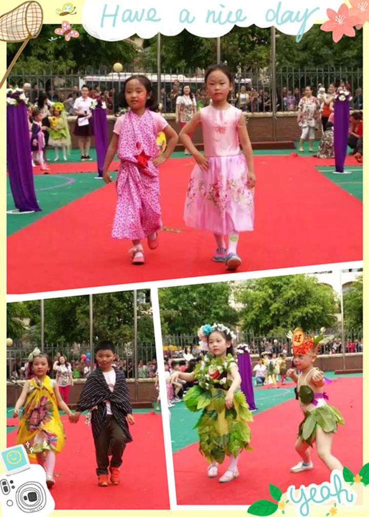 在活動中我們看到,家長、孩子齊動手,紙盒、編織袋、碟片、廢報紙、廣告紙、樹葉、花、藤、餐具、一次性桌布等都成為時裝的主要“面料”。真的是構思巧妙、別具匠心!家長和孩子們穿著自己用廢舊物品制作的一套套造型迥異的環保時裝,全面展示自信與快樂,每個人都擺出了自己最帥的造型。他們的精彩表演給大家帶來了一場令人難忘的視覺盛宴。