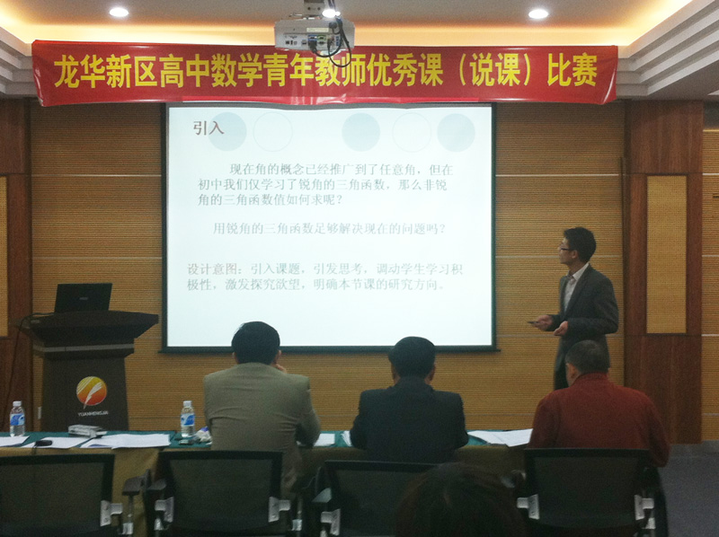 賽前,10位選手首先進行抽簽,各選手按抽簽順利依次上場,每位選手15分鐘說課時間。比賽現場,氛緊張而熱烈,各選手利用多媒體課件、音頻、視頻、板書等多種形式,配以語言表達,充分展示各自教學藝術與特色。以深圳市高中數學教研員