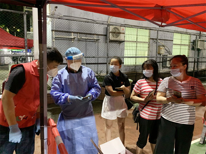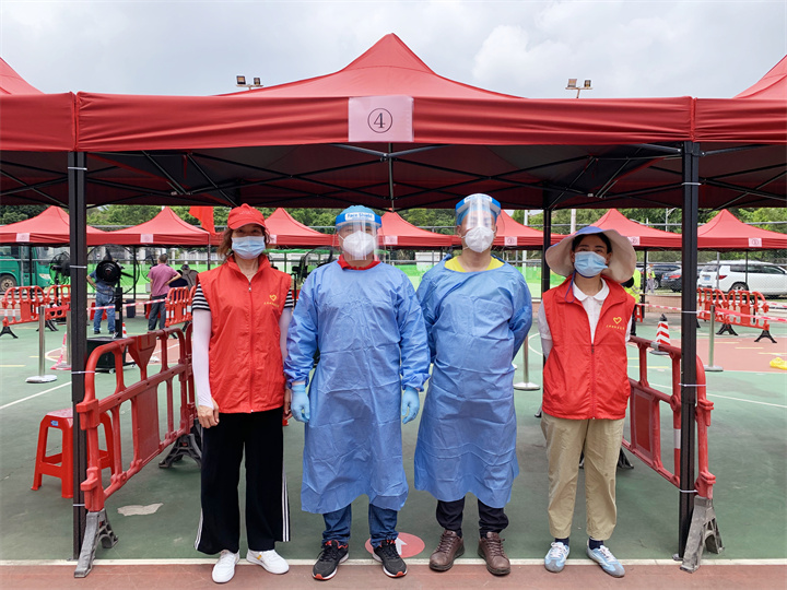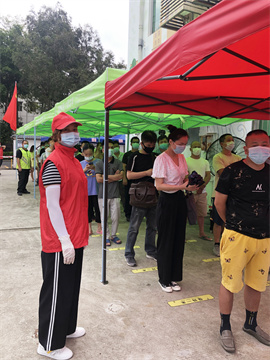 為了協助龍華區全員核酸檢測,我校5名志愿者參與了觀瀾大水田社區的志愿服務行動。大水田社區離學校較遠,路況復雜,我們每天來回大約需兩個小時。我和葉東紅同志主要負責檢測人員分流。本次檢測人員較多,需10人一組進行檢測,有一些老人和小孩兒沒有健康綠碼,我和葉東紅同志協助給他們申報并指引他們到相應區域進行檢測。