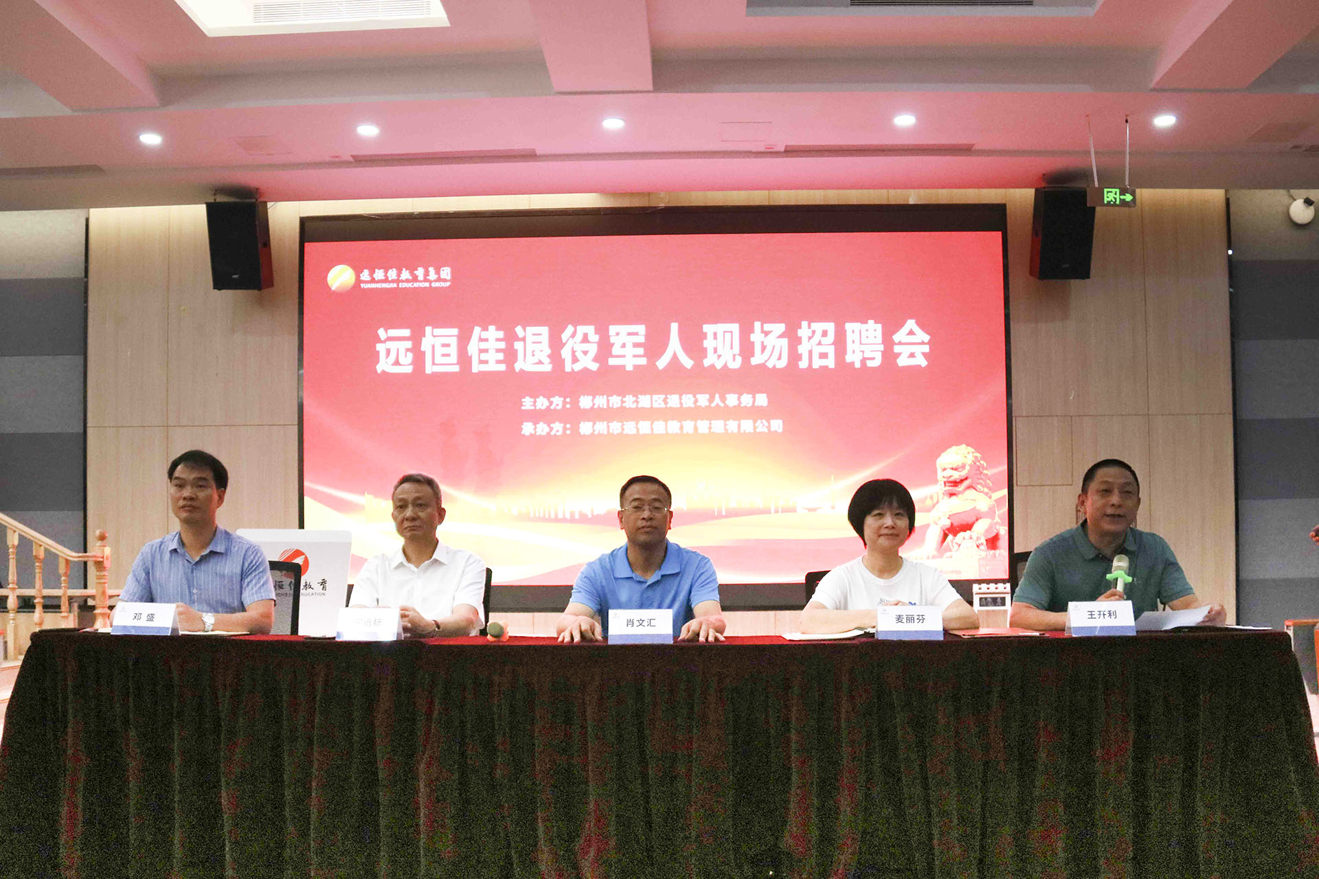 北湖區退役軍人事務局副局長肖文匯(左三),遠恒佳教育集團黨總支書記、董事長宋遠標(左二),集團董事、副總裁麥麗芬(右二),郴州遠恒佳學校副校長鄧盛(左一)參加招聘會,遠恒佳郴州公司總經理王開利(右一)主持招聘會。