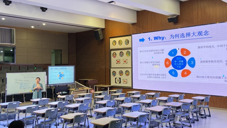 最后,長(zhǎng)壽區(qū)英語教研員任莉娜老師作了《關(guān)于大觀念統(tǒng)領(lǐng)下單元整體教學(xué)的解讀》的專題講座。她從Why-為何選擇大觀念,What-何為英語學(xué)科大觀念,How-如何基于大觀念教學(xué)設(shè)計(jì)三個(gè)方面具體地剖析了大單元教學(xué)環(huán)境下的教學(xué)思路,技能策略以及幫助學(xué)生認(rèn)知結(jié)構(gòu)的建構(gòu),情感態(tài)度的培養(yǎng)等。