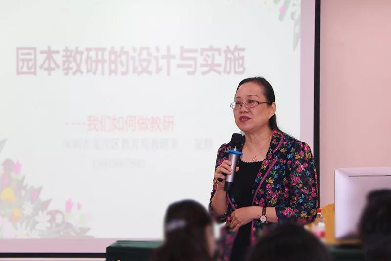 龍崗區教育局教研室幼教教研員張靜老師在一天的時間里與老師們分享和交流《園本教研的設計與實施》。張靜老師首先與老師們親切交流,了解寶安幼教集團各幼兒園園本教研的現狀、存在的問題、有哪些困惑?針對老師們的困惑和問題,張老師從教研有哪些形式(個人反思、同伴互助、專業引領)、園本教研的涵義與基本要素、園本教研八字箴言(察、思、鉆、備、討、升、跟、理)、園本教研的設計流程等方面與老師們進行交流、分享。